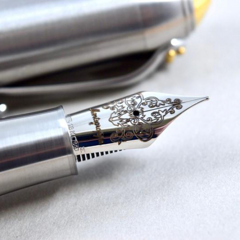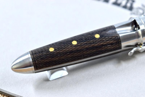 Объемный корпус из шлифованной нержавеющей стали, часть барреля ручки изготовлена из многовекового мореного дуба, торец колпачка и декоративные заклепки на корпусе выполнены из ювелирной латуни и покрыты золотом — это первое, но не единственное удивление, которое вы испытаете, увидев впервые эту ручку.