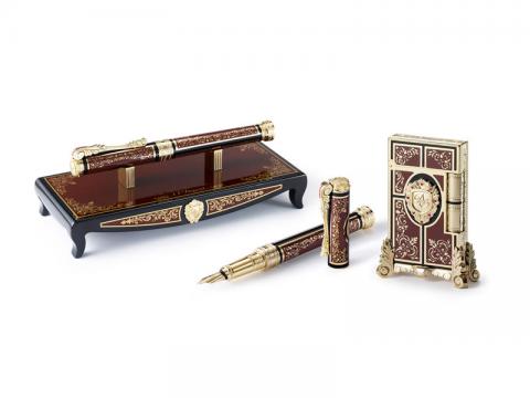 Линия Prestige отличается искусными бронзовыми деталями. Восемь рубинов украшают каждое из изделий, выпущенных в 1872 нумерованных экземплярах в память о годе основания компании S.T.Dupont. Истинные ценители останутся довольны набором для рабочего стола линии Prestige, в который также входит подставка для ручки и чернильница (172 нумерованных экземпляра).